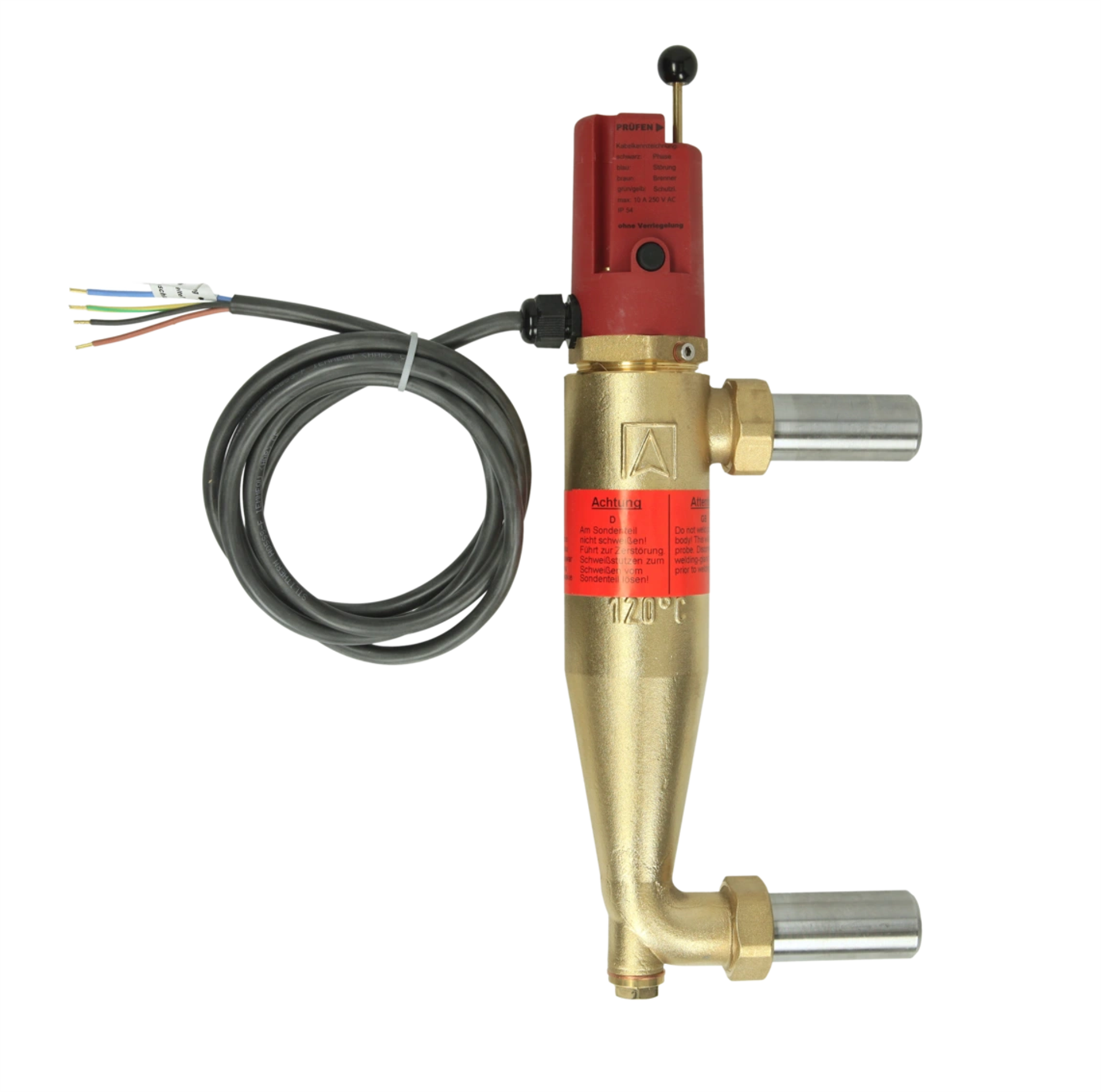 Mechanische watergebrekbeveiliging werkend via het vlotter principe voor gesloten verwarminginstallaties ter beveiliging van de verbranding DIN EN 12828. Bestaande uit sondebehuizing van gegoten MS met lasaansluiting en vlottermechanisme, elektrische schakelaar, test en ontgrendelingtoets. TÜV getest als waterstandbegrenzer voor een maximale bedrijfsdruk van 10 bar en een maximale bedrijfstemperatuur van 120 °C voor het gebruik inverwarmingsinstallaties conform DIN EN 12828. Daalt de waterstand in de boiler onder een minimaal niveau, wordt via een vlotter een schakelaarbediend die de toevoer naar de brander afsluit. Een vergrendelingverhindert zelfstandige inschakeling. Met behulp van de testtoets kan de vlotter naar beneden worden gedrukt en zodoende watertekort worden gesimule erd.Technische gegevens:- Sondebehuizing: gegoten Messing- Vlotter: kunststof- Hoogte: 358 mm- Lasaansluiting: DN 20- Max. bedrijfstemperatuur: 120°C- Max. bedrijfsdruk: 10 bar- Testdruk: 15 bar- Elektrische aansluiting: AC 250 V, 10 A- Beschermingsklasse: IP 44- Onderdeelkeurmerk: TÜV-HWB.02-232